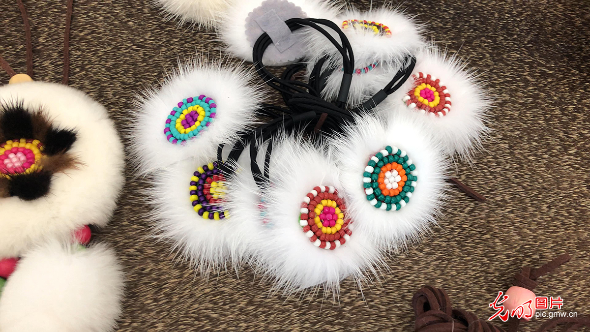 光明网讯(记者 赵艳艳 潘迪 李刚)由于常年生活在阴暗寒冷的森林里,鄂温克人非常崇拜太阳。他们用皮毛和彩石做成形似太阳的吉祥物佩戴,成为鄂温克族文化中的一个重要符号——太阳花。图为8月3日,阿荣旗查巴奇鄂温克族乡猎民村的太阳花手工艺人制作的太阳花头绳。(赵艳艳摄/光明图片)