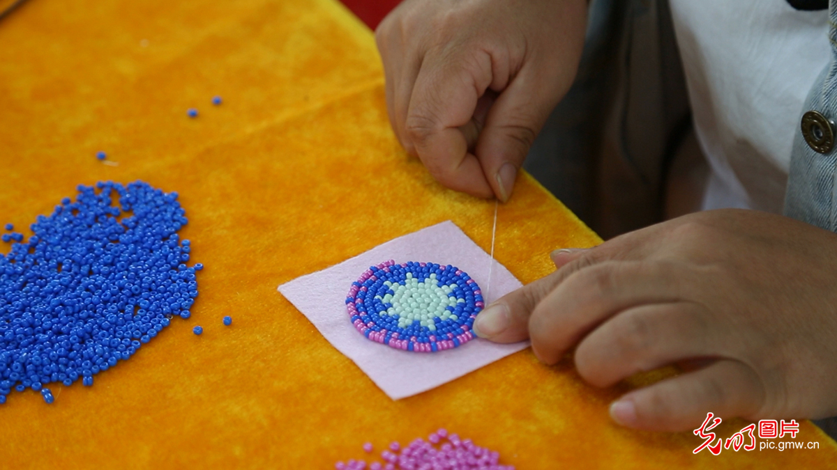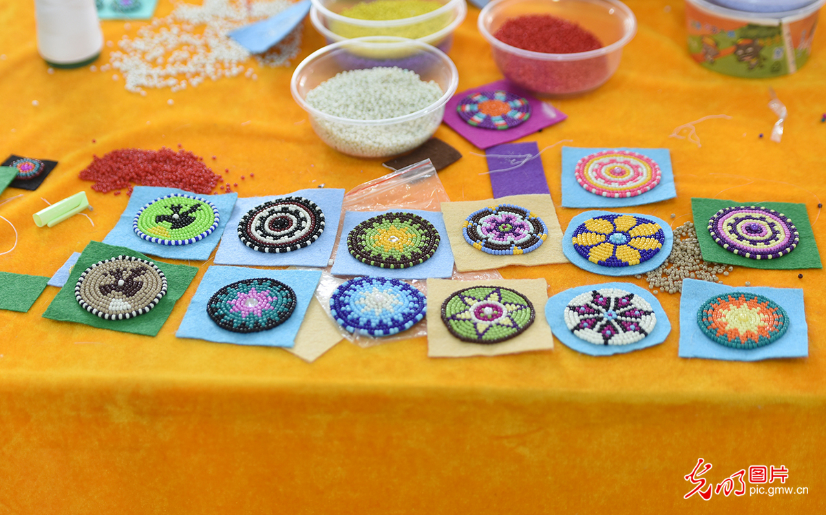 太阳花最早的制作方式是兽皮为底,缀以彩石。现在,随着国家对少数民族文化越来越重视,鄂温克族的太阳花也焕发出新的生命力。除了传统的制作方式,手工艺人们用彩珠、兔毛、人造毛等材料,不断地拓展着太阳花新的可能。图为8月3日,阿荣旗查巴奇鄂温克族乡猎民村的手工艺人在制作太阳花。(李刚摄/光明图片)
