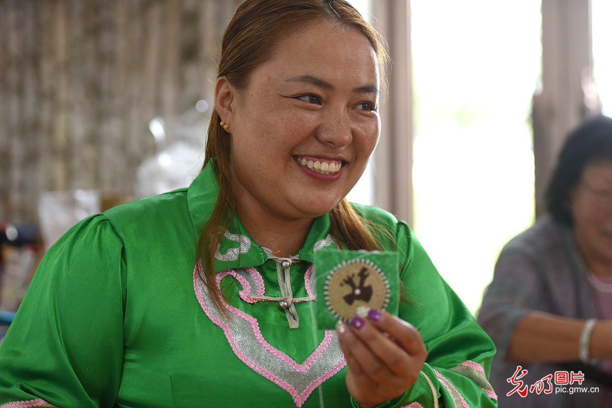 李若楠是鄂温克族太阳花手工艺制作传承人,起初,做太阳花只是她和伙伴们的业余爱好。“后来村子里开展民俗旅游,很多游客都对我们的太阳花很感兴趣。我们就想,为什么不做点太阳花来卖呢?这样不仅能增加我们的收入,还能把鄂温克的民族文化传播出去。”她说。图为8月3日,李若楠向游客介绍太阳花的寓意。(潘迪摄/光明图片)