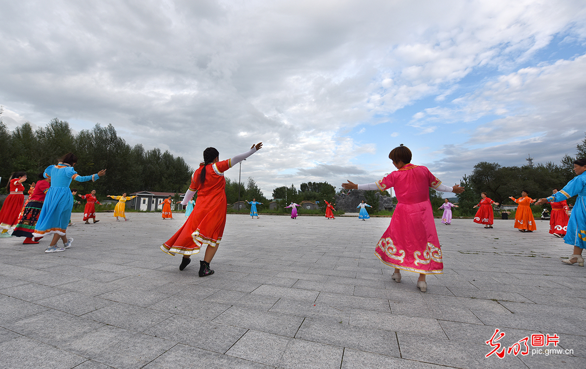 通过民族手工艺品制作来脱贫、增收、致富,只是鄂温克族人决战决胜脱贫攻坚的一部分。自1990年放下猎枪以来,他们成立农机合作社,实行全村土地整体流转,进行村集体资产股份制改革,发展民俗旅游,逐步走上了致富的道路。2019年,猎民村人均纯收入25000元。在打赢脱贫攻坚战的征程中,谱写出祖国北疆少数民族地区民族团结、和谐发展、共同繁荣的壮丽诗篇!图为8月3日,猎民村的村民在老神树广场跳起民族舞蹈。(潘迪摄/光明图片)