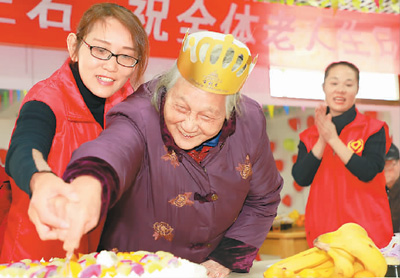 2020年12月25日,在江西省赣州市全南县城西社区智慧养老综合服务中心,工作人员陪过生日的寿星一起开心地切蛋糕。尹其奇摄(人民图片)