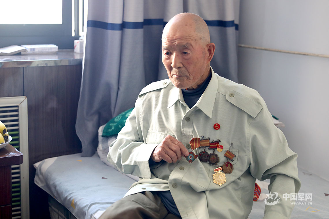 康凤岐向记者介绍他获得的奖章和纪念章。中国军网记者 张智程 摄