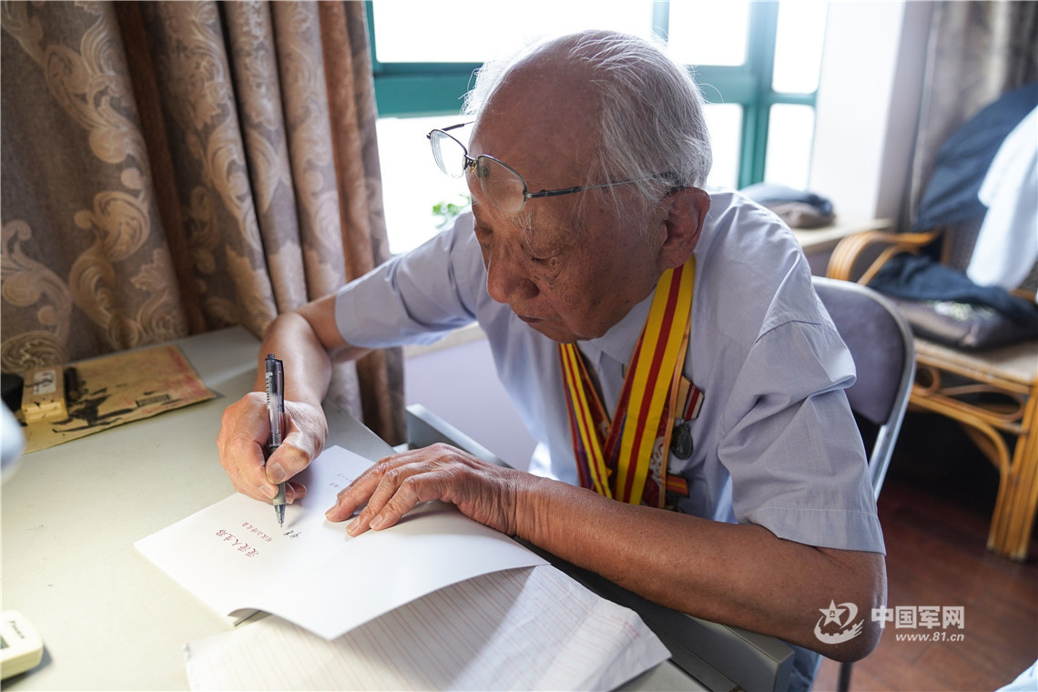 刘汉山在自己写的诗集上题字。中国军网记者 伍行健 摄