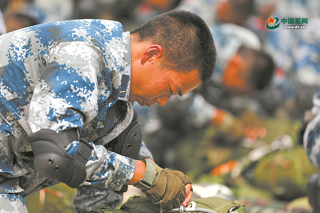 7月初,华中某机场,空降兵某旅组织春季入伍新兵首次进行小飞机跳伞训练。烈日下,机场地面温度接近50摄氏度,新兵们有条不紊地整理伞具。