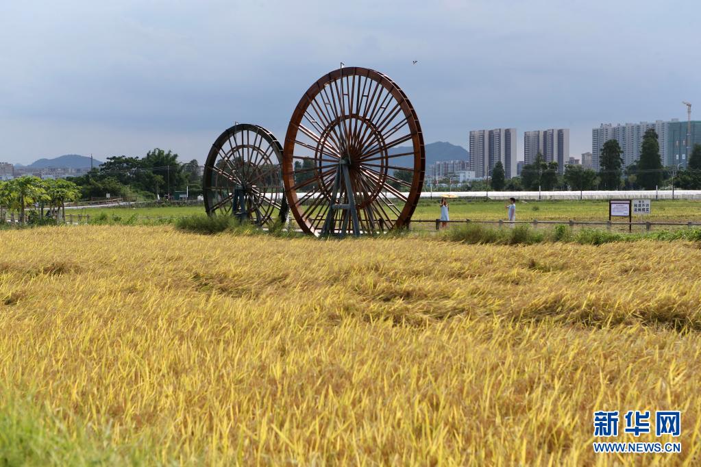 7月14日,在广东省中山市南朗镇左步村,游客在稻田里拍照。新华社记者 耿馨宁 摄