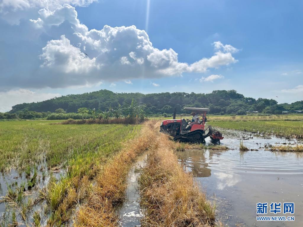 7月14日,在广东省中山市南朗镇左步村,冯建伟驾驶拖拉机在稻田里劳作(手机照片)。新华社记者 毛一竹 摄