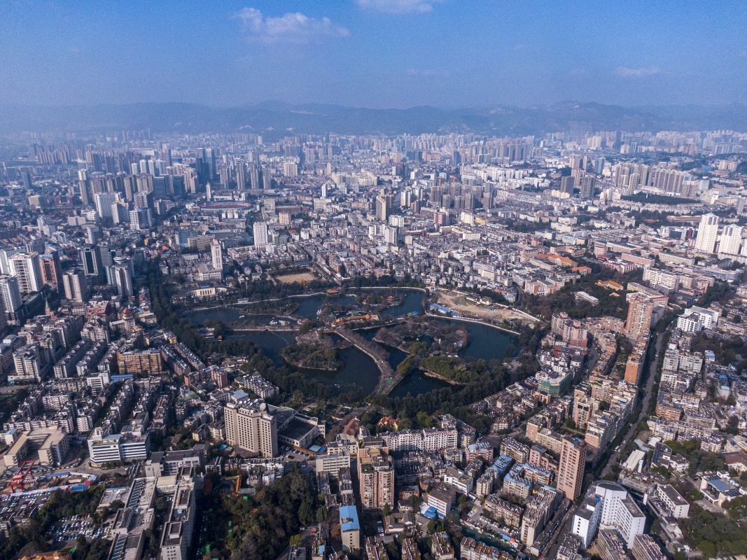 从中共云南地下党建党旧址上空俯瞰昆明城区(无人机照片,1月22日摄)。新华社记者 江文耀 摄