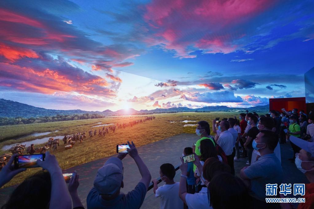 7月15日,观众在中国共产党历史展览馆“‘不忘初心、牢记使命’中国共产党历史展览”上观看红军长征过草地场景视频。新华社记者 陈晔华 摄