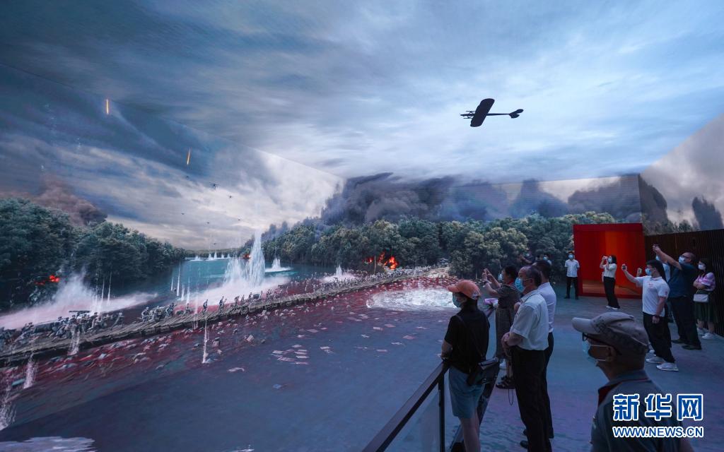 7月15日,观众在中国共产党历史展览馆“‘不忘初心、牢记使命’中国共产党历史展览”上观看湘江战役视频。新华社记者 陈晔华 摄