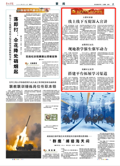 为增强宣讲效果,提高学习成果转化率,该部在遵守保密规定的前提下,线上利用公众号、军职在线等平台,将学习习主席“七一”重要讲话精神与党史学习教育有机结合,实现授课视频、优质教案、学习材料“云端”共享;线下组织官兵收集归纳理论要点,撰写学习心得体会,在各任务点位举办理论问答竞赛、阵地感悟分享会等活动,把学习讲话精神融入一线战位。此外,他们还通过营区橱窗、文化长廊、知识展板等载体营造浓厚学习氛围,进一步深化官兵对习主席“七一”重要讲话精神的理解感悟。