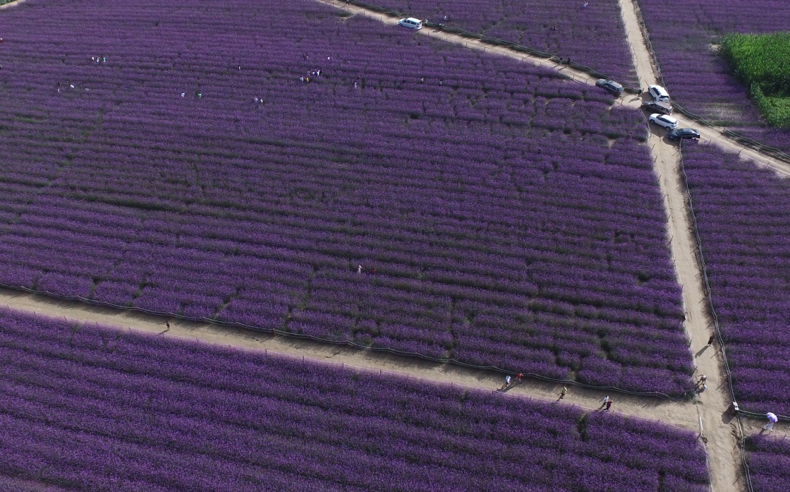 游人在延安南泥湾赏花游览(2020年8月19日摄,无人机照片)。新华社发(祁小军 摄)