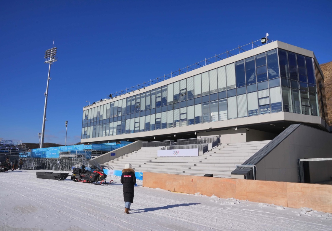 12月31日,工作人员从张家口赛区国家越野滑雪中心的技术楼前走过。