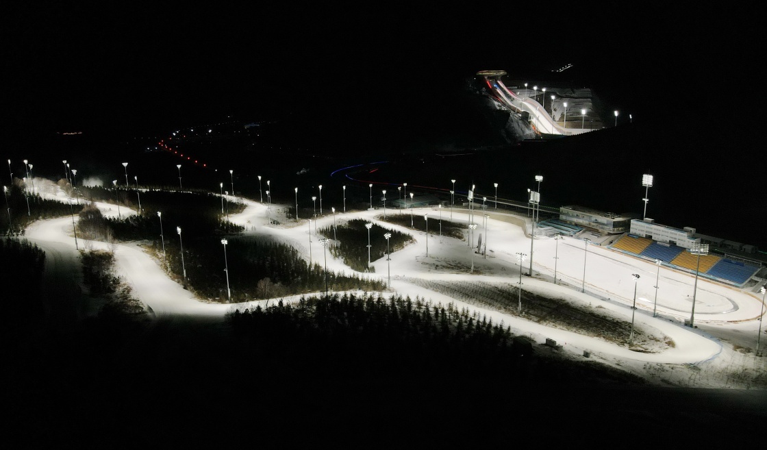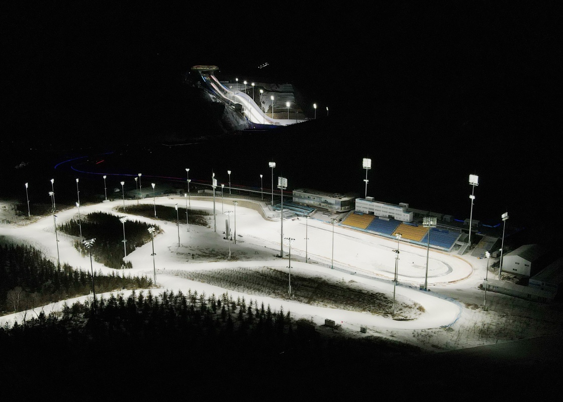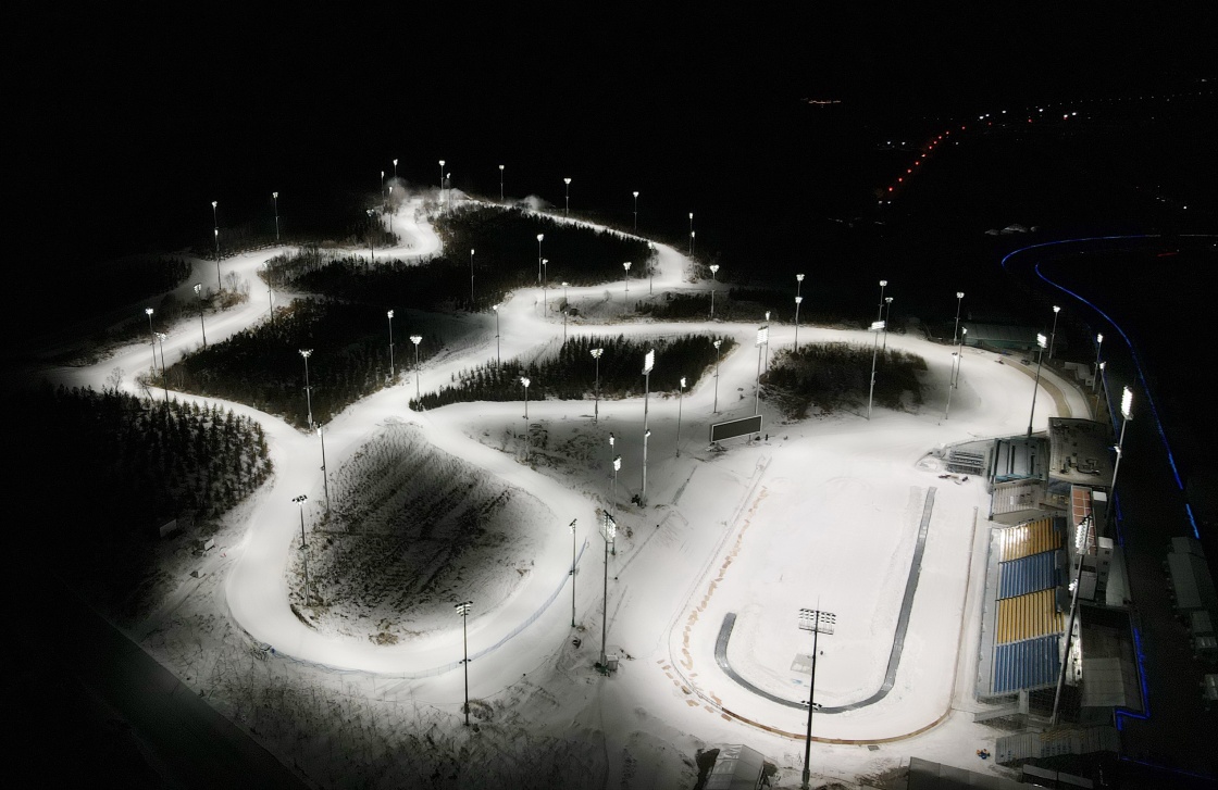这是12月30日拍摄的张家口赛区国家越野滑雪中心的夜景(无人机照片)。新华社记者 杨世尧 摄