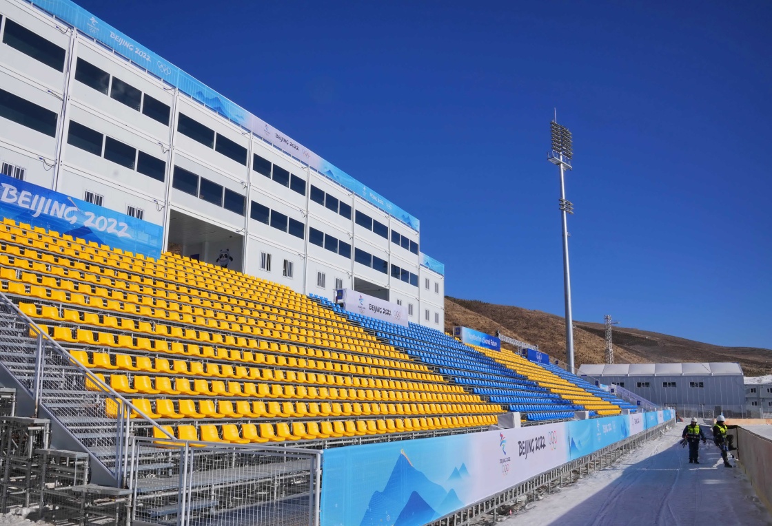 12月31日,工作人员在张家口赛区国家越野滑雪中心的观众看台边工作。新华社记者 杨世尧 摄