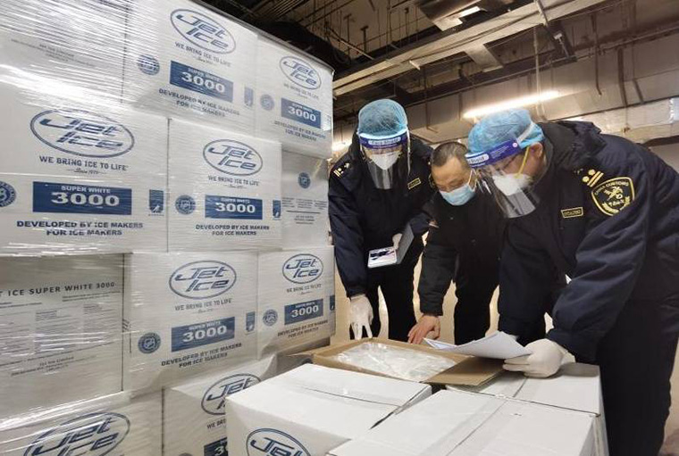 北京海关所属朝阳海关关员在国家速滑馆验放冰漆。北京海关供图