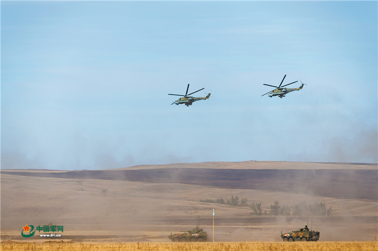 9月14日,中方战车在俄方直升机支援下向“敌”阵地发起冲击。司 磊摄