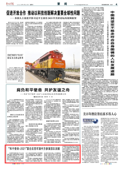 9月11日至25日,“和平使命-2021”上海合作组织联合反恐军事演习在东古兹靶场举行,演习课题为上合组织成员国部队筹备并实施联合反恐行动。