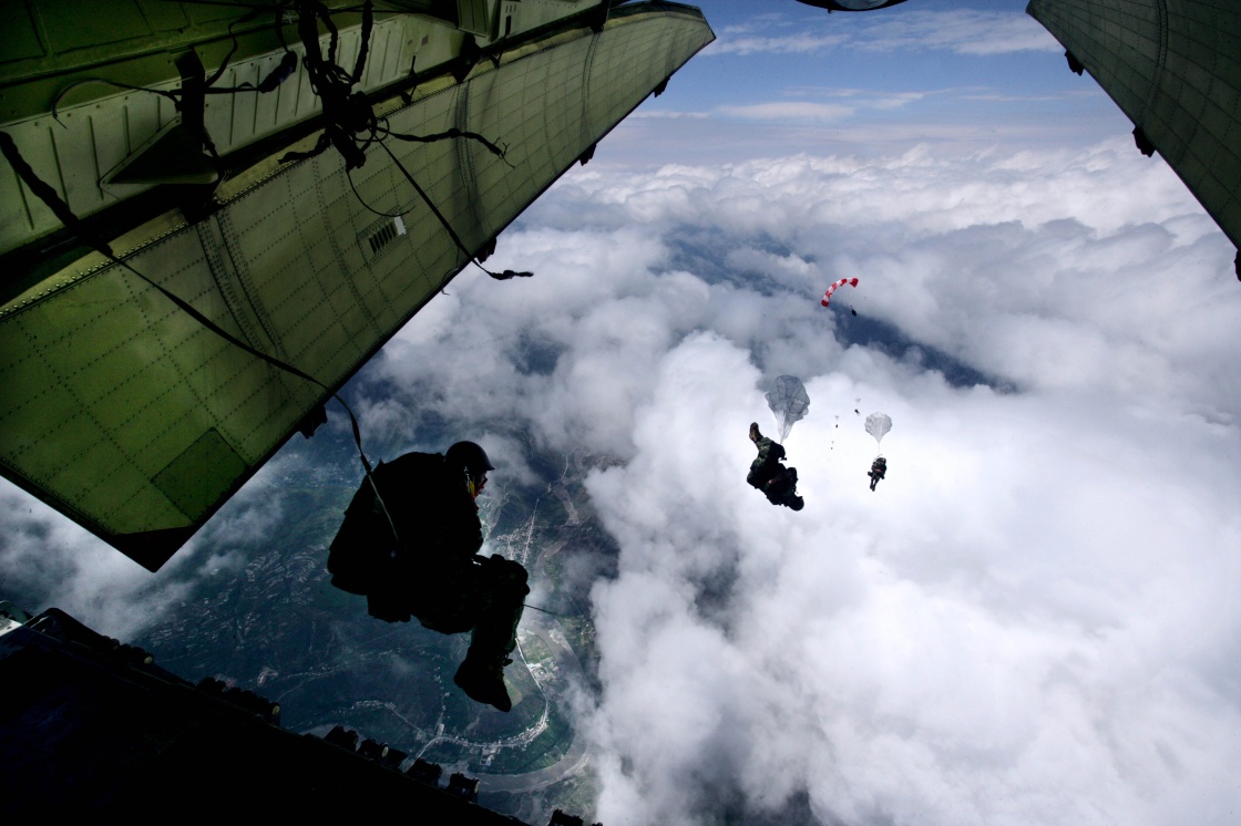 15名空降兵从地震灾区四川茂县上空4999米的高空奋不顾身跳下,进入道路阻断的灾区参加救援(2008年5月14日摄)。新华社发(刘应华 摄)