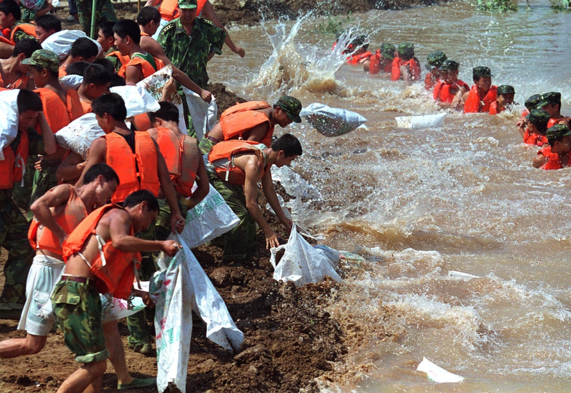 解放军官兵在湖北石首久合垸乡团山河支堤“管涌”险情处抗洪抢险(1998年8月11日摄)。新华社记者 李刚 摄