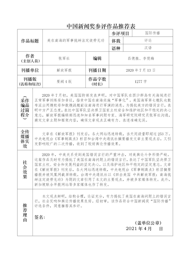解放军新闻传播中心2021年中国新闻奖推荐作品公示