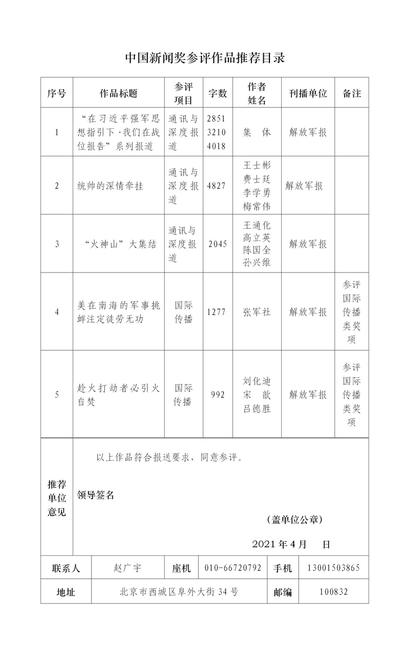 解放军新闻传播中心2021年中国新闻奖推荐作品公示