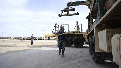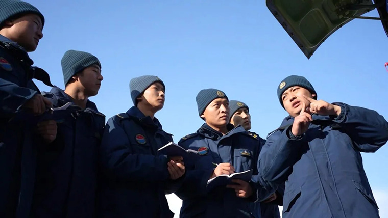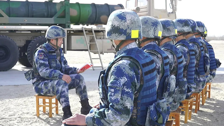 △大漠戈壁,空军地空导弹某部正在组织年终军事训练考核,在连续装退筒弹课目上,下士辛尚骏和战友们紧密协同、默契配合,成绩比上一次提升了整整30秒,打破了营里考核的纪录。
