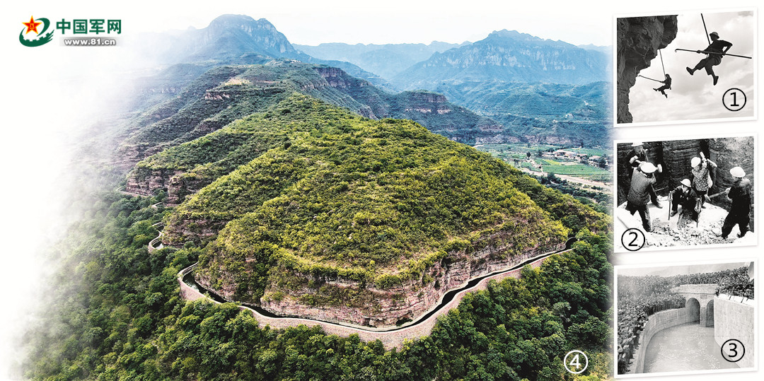 图①:民工在红旗渠施工现场凌空除险。