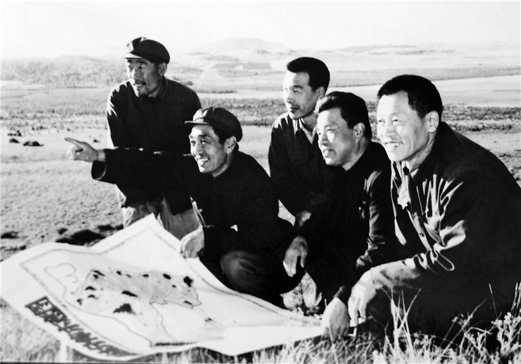 塞罕坝机械林场建设初期,王尚海(右二)、刘文仕(左二)等林场领导在茫茫荒原规划美好蓝图。