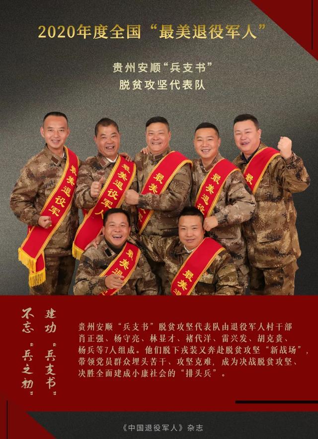 贵州安顺“兵支书”脱贫攻坚代表队由退役军人村干部肖正强、杨守亮、林显才、褚代洋、杨兵、雷兴发、胡克贵等7人组成。他们永葆军人本色、续写军人情怀,发挥退役军人党员的先锋模范作用,脱下戎装又奔赴脱贫攻坚“新战场”,以敢打硬仗的决心、敢打必胜的血性,带领党员群众埋头苦干、攻坚克难,成为决胜全面建成小康社会、决战脱贫攻坚的“排头兵”。他们助推农村产业革命、推进基层社会治理,逐步成长为基层党建领头人、和谐稳定维护人、人民群众贴心人,为推动安顺经济社会发展发挥了重要的示范引领和带动作用。