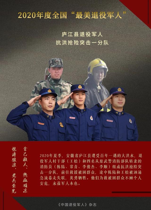 2020年夏季,安徽省庐江县遭受百年一遇的大洪水。7月22日,该县同大镇石大圩连河段突然漫堤溃口,危急时刻,退役军人村干部王松和4名消防员陈陆、常青、李俊杰、李顺组成抗洪抢险突击一分队,前往救援被困群众。途中橡皮艇侧翻,常青、李俊杰、李顺拼尽全力成功脱险,陈陆和王松被汹涌急流卷走失联。经过不断搜救,7月24日,陈陆的遗体被找到,王松的遗体直至10月4日才被找到。在抢险救援中,他们不顾个人安危,哪里最危险就战斗在哪里,哪里最困难就出现在哪里,真正把抗洪抢险一线作为展现使命责任担当的“磨刀石”。陈陆、王松已被追认为烈士。