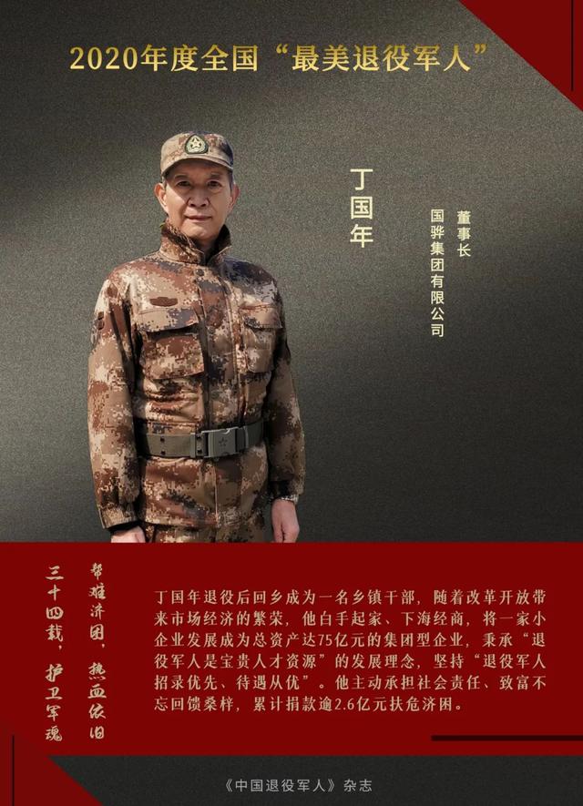 丁国年退役后回乡成为一名乡镇干部,随着改革开放带来市场经济的繁荣,他白手起家、下海经商,将一家小企业发展成为总资产达75亿元的集团型企业。公司成立至今,他始终秉承“退役军人是宝贵人才资源”的发展理念,坚持“退役军人招录优先、待遇从优”原则,在企业内营造尊军、崇军、荣军的文化氛围。截至目前,公司累计招录退役军人2100余人,其中430余人成长为中高级管理人才。他主动承担社会责任、致富不忘回馈桑梓,设立“东方慈善扶贫基金”“国骅建设慈善基金”,扶危济困、捐资助学,累计捐款逾2.6亿元。曾获浙江省“最美退役军人”、浙江省“十大慈善之星”等称号。