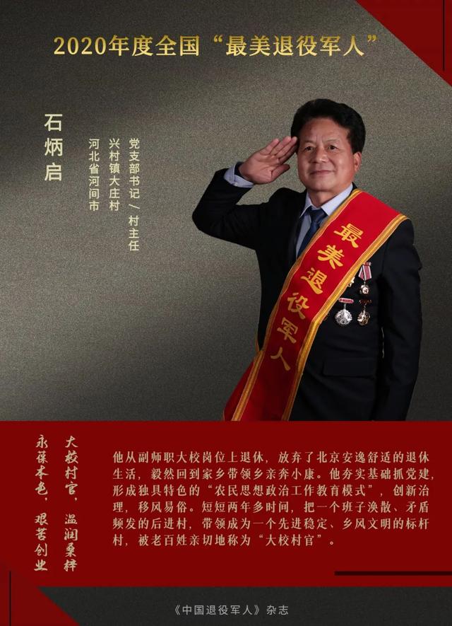 2015年,石炳启从副师职岗位退休。2018年2月,他放弃北京安逸舒适的退休生活,毅然回到家乡带领乡亲奔小康。他夯实基础抓党建,形成独具特色的“农民思想政治工作教育模式”;针对村内垃圾、道路积水、违规建筑等顽症痼疾,建立20项村规民约整治村容村貌;以制止人情攀比、大操大办等不良婚俗现象为突破口,探索村民自治管理新路,不断推进移风易俗。短短2年多时间,把一个班子涣散、矛盾频发的后进村,带领成为一个先进稳定、乡风文明的标杆村,被老百姓亲切地称为“大校村官”。曾获“全国模范退役军人”称号。