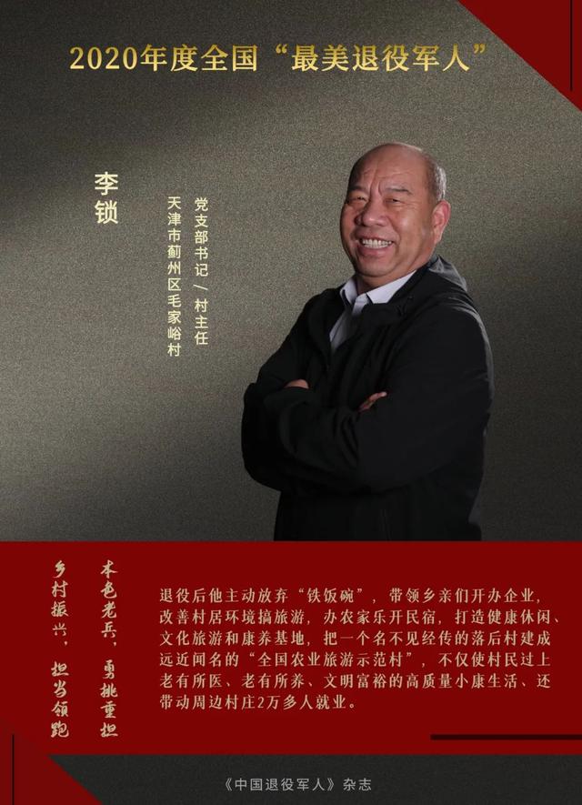 20年前,毛家峪村是个“光棍村”,李锁退役后主动放弃“铁饭碗”,带领乡亲们开办企业,改善村居环境搞旅游,办农家乐开民宿,打造健康休闲、文化旅游和康养基地,把一个名不见经传的落后村建成了远近闻名的“全国乡村旅游重点村”,不仅使村民过上老有所医、老有所养、文明富裕的高质量小康生活,还带动周边村庄2万多人就业。曾获“全国劳动模范”“中国乡村旅游致富带头人”等称号。