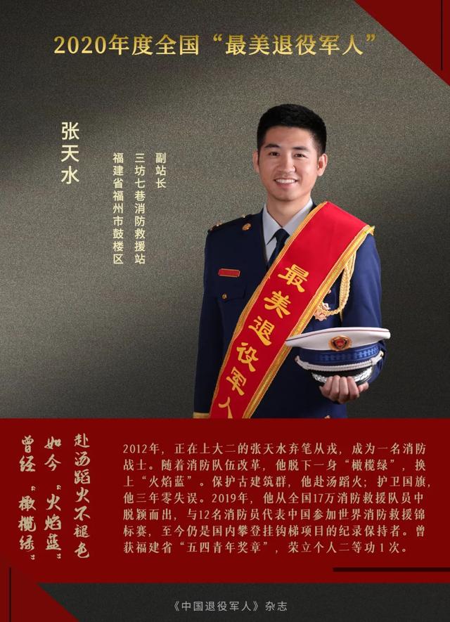 2012年,正在上大二的张天水携笔从戎,成为一名消防战士。随着消防队伍改革,他脱下一身“橄榄绿”,换上“火焰蓝”。他把青春描绘在保卫三坊七巷古建筑群消防安全的艰巨任务中,倾注在全国唯一一支由消防救援队伍承担省会城市升降国旗的光荣使命里。2019年,因体能素质、业务技能拔尖,他从全国17万消防救援队员中脱颖而出,与12名消防员代表中国参加有“消防员奥运会”之称的世界消防救援锦标赛,至今仍是国内攀登挂钩梯项目的纪录保持者。曾获福建省“五四青年奖章”,荣立个人二等功1次。