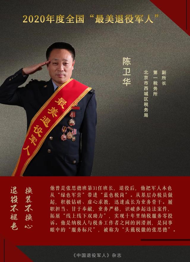 陈卫华曾任张思德班第31任班长。退役后,他把“绿色军营”的好思想、好作风、好传统带进“蓝色税岗”。他从基层办税员做起,积极钻研、虚心求教,迅速成长为业务骨干。他履职担当、甘于奉献,严格审核每笔契税业务,树规范铸防线,识破多起违法案件;拓展“线上线下双助力”,实现10年里纳税服务零投诉。疫情期间,他还积极探索分级分类服务模式,当好“非接触式”办税的践行者。他是纳税人与税务工作者之间的润滑剂,是同事眼中的“服务标尺”,被称为“头戴税徽的张思德”。曾获“首都五一劳动奖章”,获“首都劳动模范”称号。