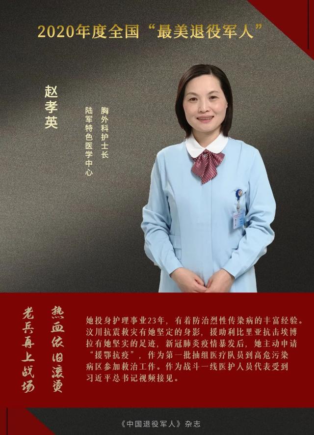 赵孝英投身护理事业23年,有着防治烈性传染病的丰富经验。汶川抗震救灾有她坚定的身影,援助利比里亚抗击埃搏拉有她坚实的足迹。新冠肺炎疫情发生后,她主动申请“援鄂抗疫”,作为第一批抽组医疗队员,到武汉金银潭医院、火神山医院的高危污染病区参加救治工作。曾获“全国先进工作者”称号。