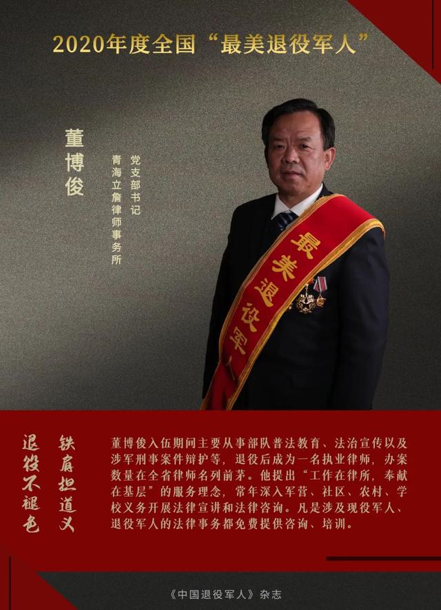 董博俊入伍期间主要从事部队普法教育、法治宣传以及涉军刑事案件辩护等,退役后成为一名执业律师,办案数量在全省律师中名列前茅。他爱岗敬业,主动担当,提出“工作在律所,奉献在基层”的服务理念,常年深入军营、社区、农村、学校义务开展法律宣讲和法律咨询。他始终不忘部队教育培养之恩,凡是涉及现役军人、退役军人的法律事务都免费提供咨询、培训。曾获“青海省优秀退役军人”称号。