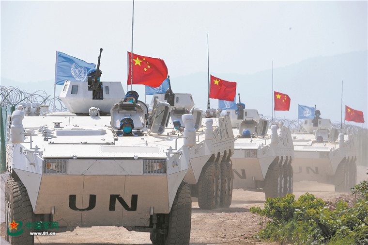 中国参演官兵驾乘装甲输送车向目标地域行进。