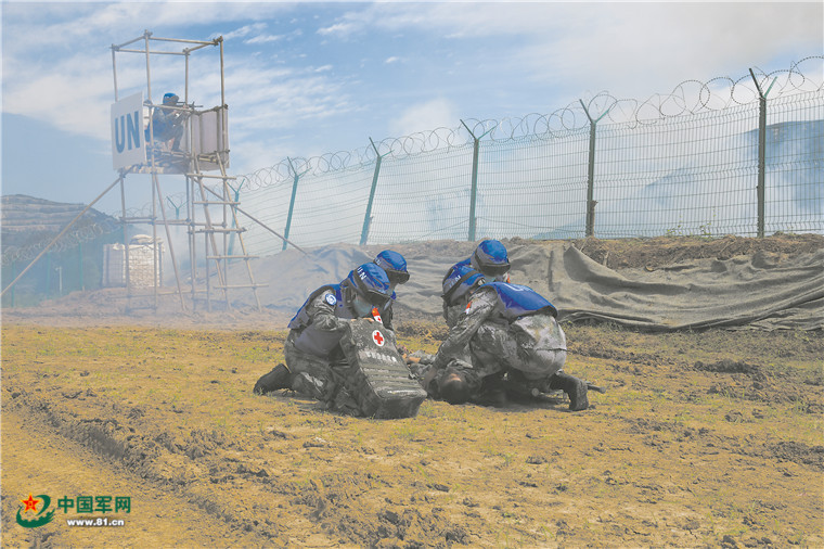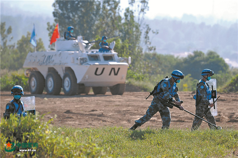 中国参演官兵在保护平民课目演练中清查周边场地。