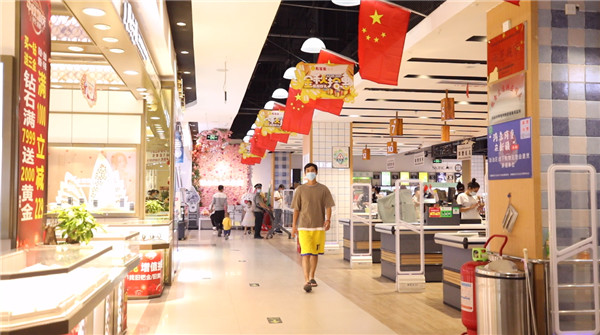 在和田市建设西路,笔者看到沿街的商铺都自发悬挂起了五星红旗,店内各类装饰也是以“中国红”为主基调,放眼望去火红一片,给人强烈的视觉震撼。除了沿街商铺外,和田各大商超也自发在店内挂起小国旗,营造出浓厚的节日氛围。