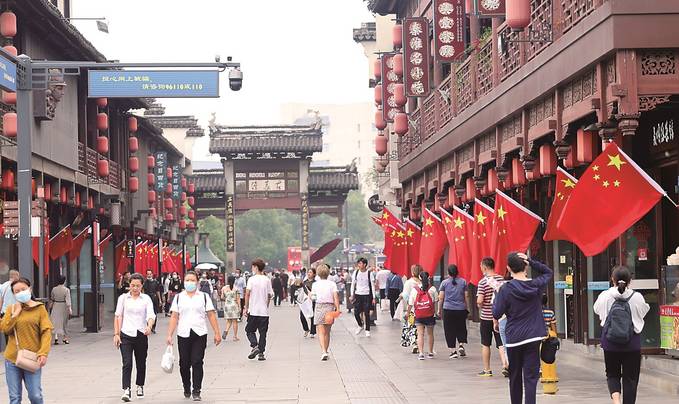 9月27日,南京夫子庙景区挂上了鲜艳的五星红旗和大红灯笼,喜迎国庆。 新华日报记者 宋宁 摄