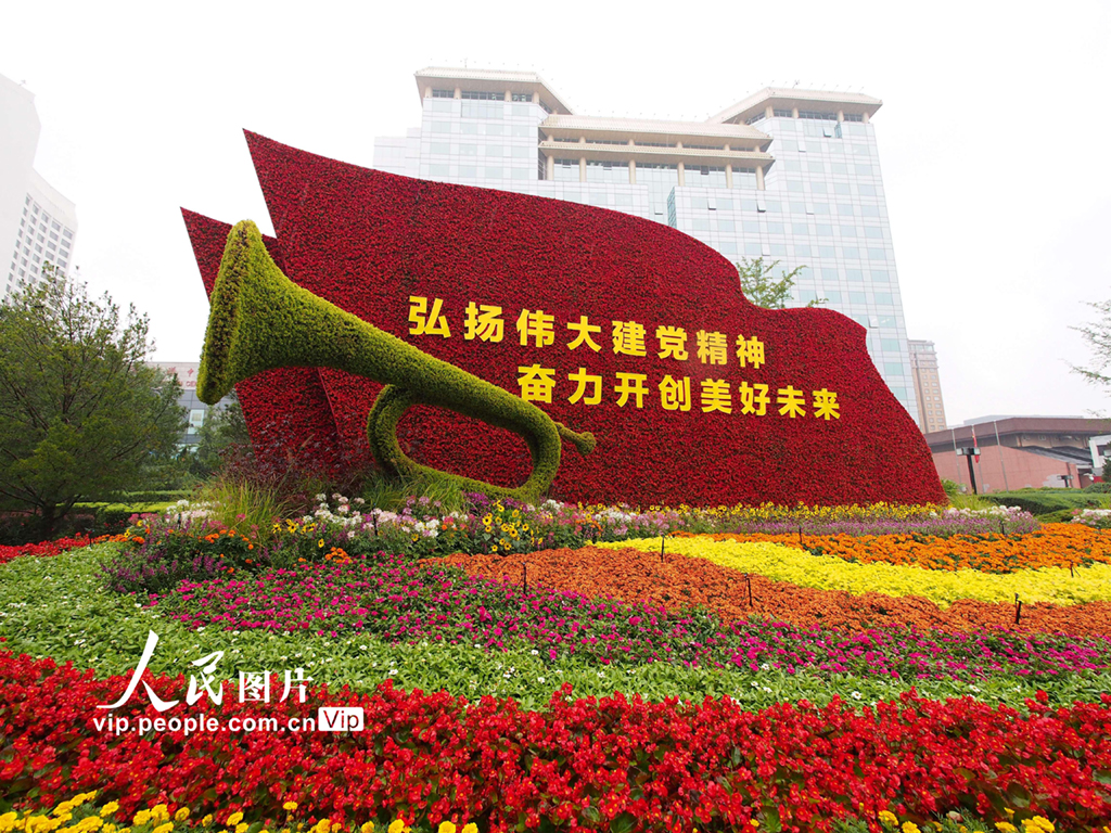 花坛顶高8米,以嵌有“弘扬伟大建党精神,奋力开创美好未来”文字的红旗为主景,寓意新时代领航者吹响继续前进的嘹亮号角,走好新的赶考之路,开创更加美好的未来。