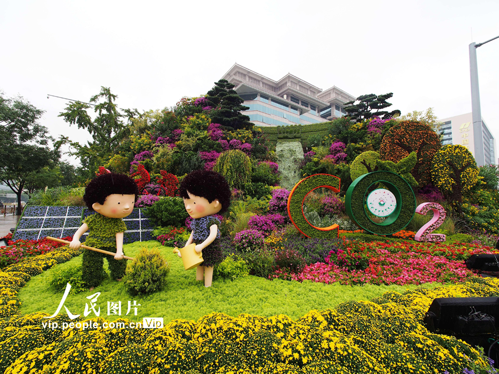 花坛顶高9.5米,通过百花齐放春满园的场景,配以白鹤滩水电站、太阳能板、骑行的人、植树的儿童、碳中和计算互动装置等,展示出通过提升林业碳汇,助力实现碳中和,同时展望绿色发展的美好明天。