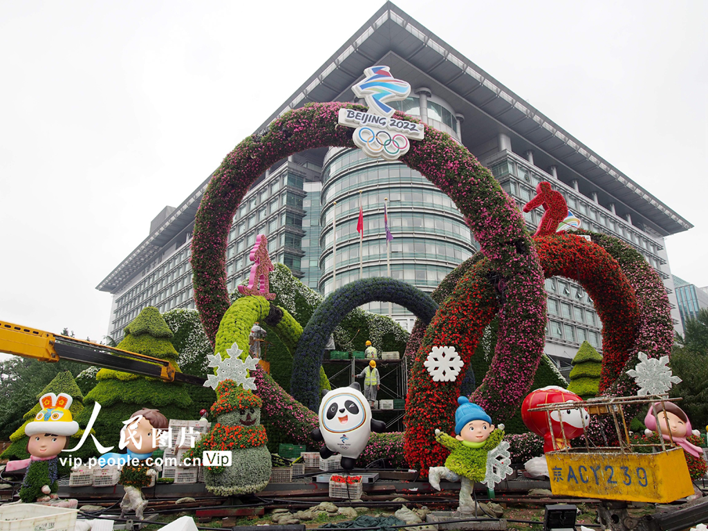 北京西单西南角的“喜迎冬奥”主题花坛。