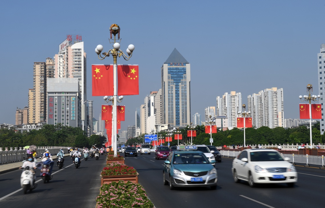 国庆节临近,广西南宁城市道路两边挂满国旗,洋溢着喜庆祥和的气氛。