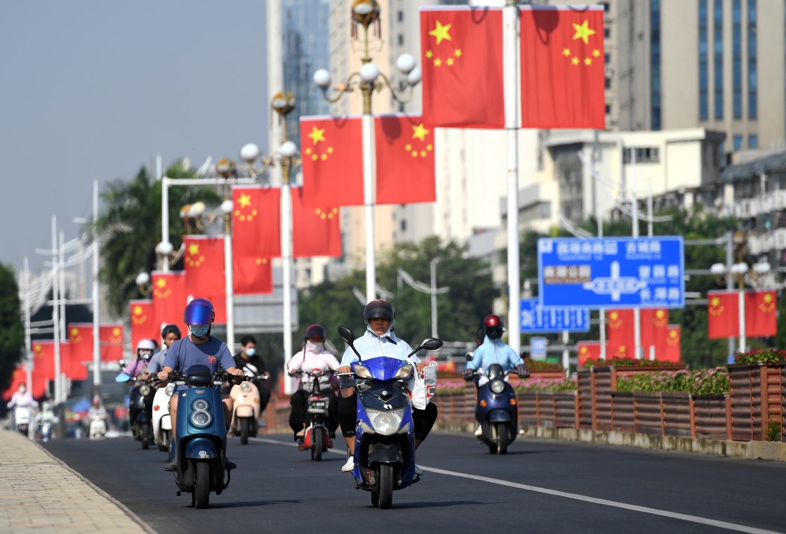 9月29日,市民从挂满国旗的广西南宁市南湖大桥上经过。