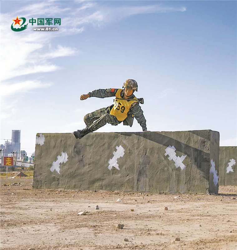 图④:武警新疆总队某支队第三季度军事训练考核中,一名战士正在通过障碍。 余 博摄