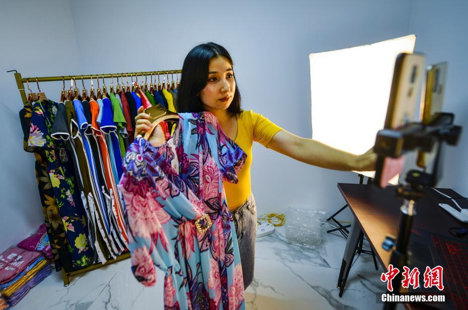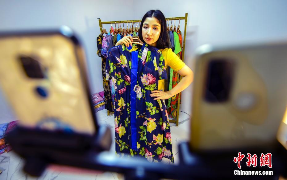 8月5日,新疆乌鲁木齐市地王商品城电子商务产业园直播间里,努热曼·木沙正在通过网络直播推销自己的服装。据努热曼·木沙说,自己有实体服装店,一个月前接触直播带货,目前网络销售额已和实体店不相上下。据介绍,地王商品城地处乌鲁木齐市火车南站商圈,周边类似批发市场众多,涉及商户万余户。为了加快传统批发零售业转型,该商品城开设7000平米的直播间,并举办“带货主播实训营”,为商圈内的传统批发零售商户提供线上销售培训及服务,推动数字经济和实体经济深度融合。 中新社记者 刘新 摄