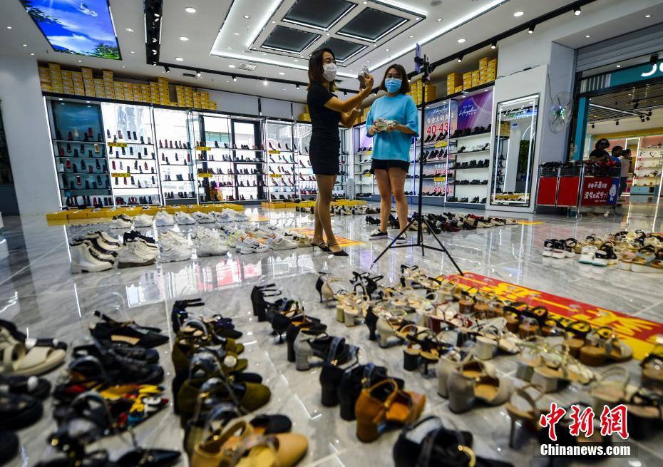 8月5日,新疆乌鲁木齐市地王商品城一鞋店里,经过培训的工作人员正在通过网络直播,推销店里的商品。据介绍,地王商品城地处乌鲁木齐市火车南站商圈,周边类似批发市场众多,涉及商户万余户。为了加快传统批发零售业转型,该商品城开设7000平米的直播间,并举办“带货主播实训营”,为商圈内的传统批发零售商户提供线上销售培训及服务,推动数字经济和实体经济深度融合。 中新社记者 刘新 摄