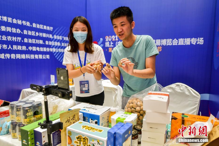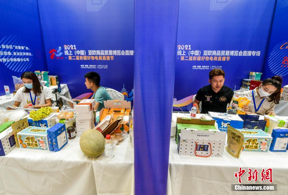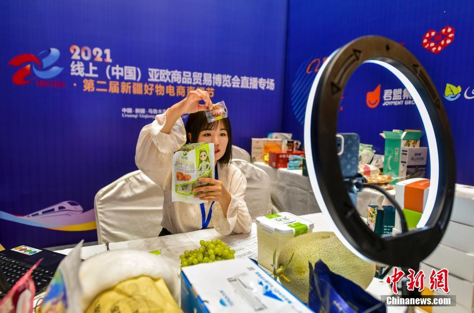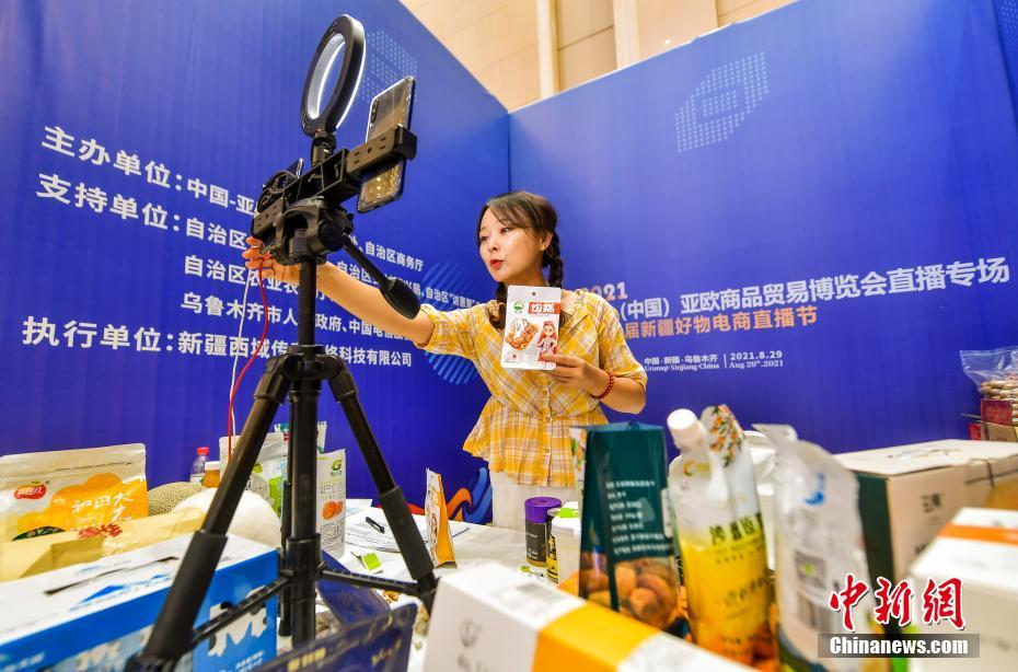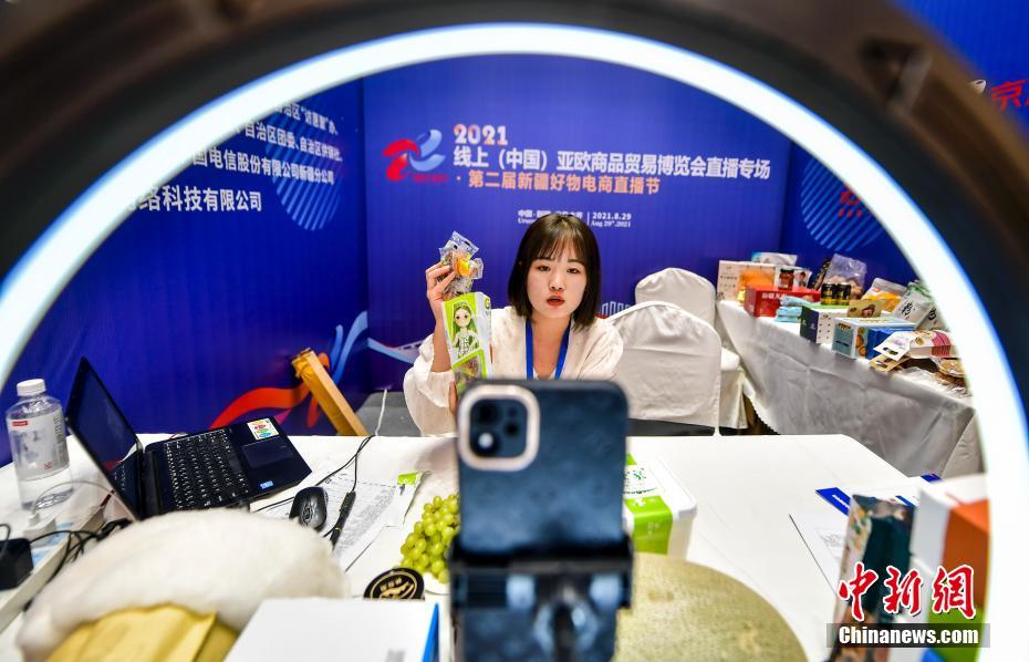 8月29日,2021线上亚欧商品贸易博览会直播专场·第二届新疆好物电商直播节在新疆乌鲁木齐市举办,活动整合多个直播平台,携手当红头部主播与新疆本地网红线上带货,推动新疆农特产品触网上行,助力乡村振兴。图为主播通过网络平台向网友推介新疆农特产品。 中新社记者 刘新 摄